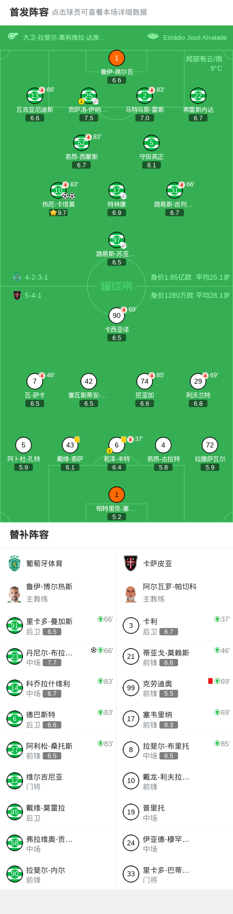 第43分钟,葡萄牙体育球员贡萨洛-伊纳西奥助攻热尼-卡塔莫打入一球。